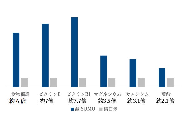 「澄 SUMU」は玄米加工品のため、ぬか層や胚芽を含んでいます。そのため、白米に比べ、食物繊維は約6倍、ビタミンEが約7倍、マグネシウムは約3.5倍※と栄養素を多く含み、栄養バランスに優れています。
