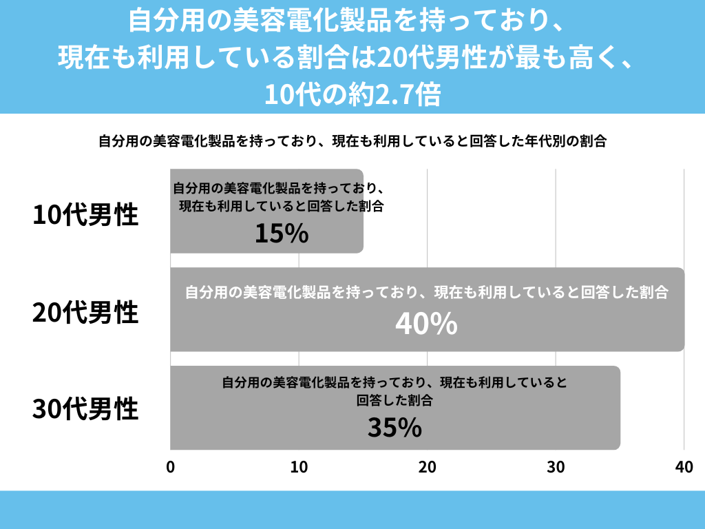 【自分用の美容電化製品を持っており、現在も利用している割合は20代男性が最も高く、10代の約2.7倍】