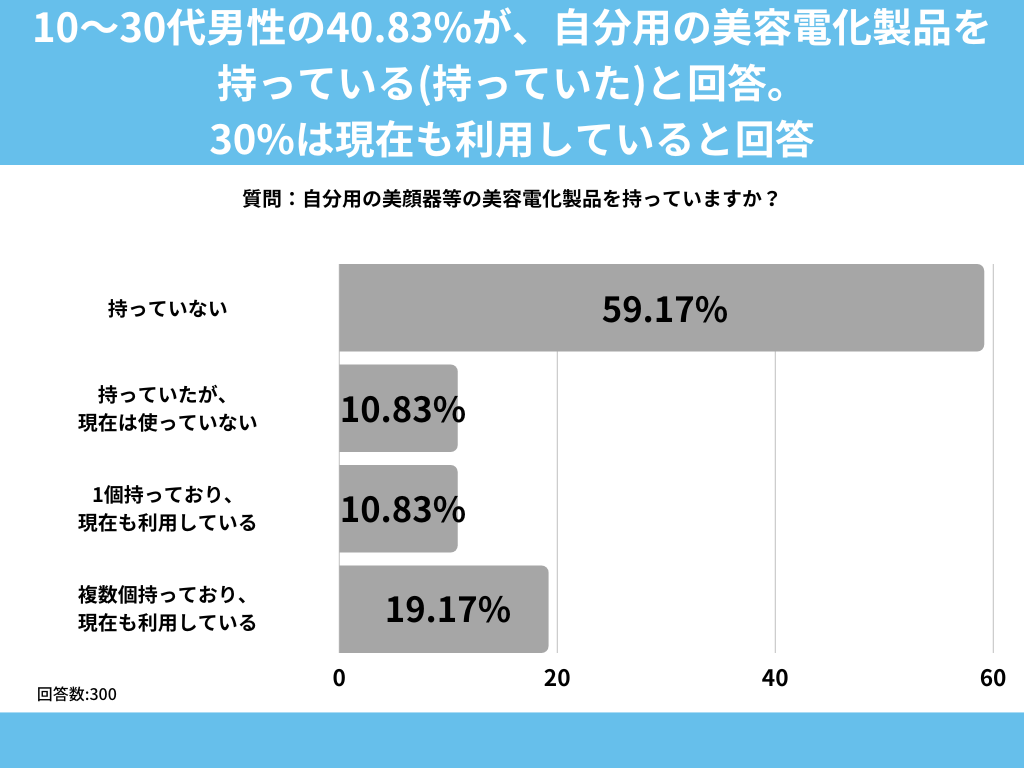 10~30代男性を対象とした「自分用の美顔器等の美容電化製品を持っていますか?」というアンケートで最も多かった回答は「持っていない」で59.17%でした。