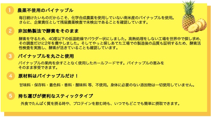 「KOSO POWER PLUS」は農薬を使わずに育てた南米産パイナップルを丸ごと使用。パイナップル酵素としては日本で唯一、非加熱製法を施し、活きた酵素を摂取できます。食べ過ぎや、夜遅い時間にご飯を食べてしまった時など、たんぱく質と一緒に摂ってあげることで食後ケアや栄養補給をサポート!