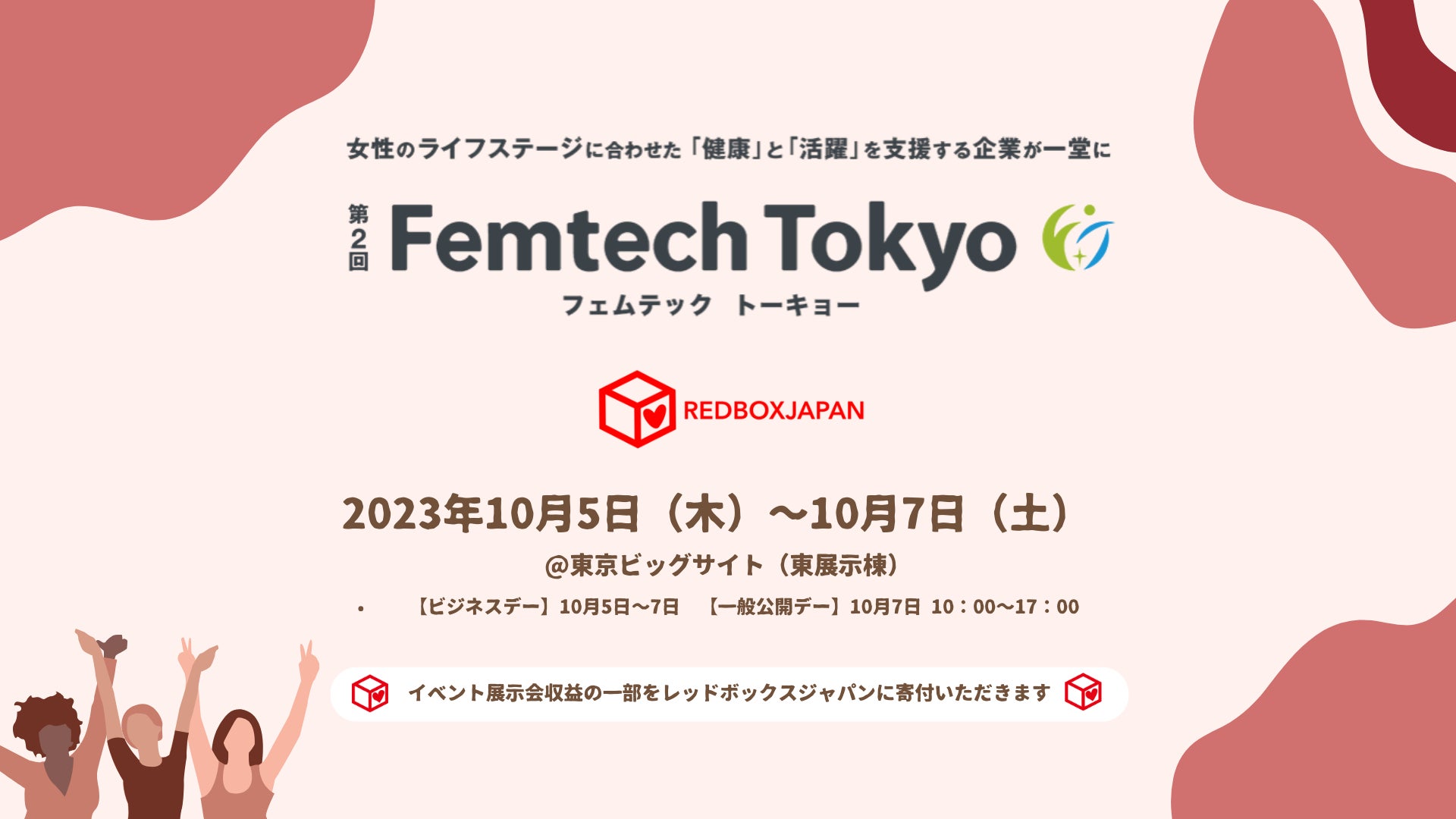 「Femtech Tokyo」では、女性のライフステージにおける様々な課題を解決できる企業が一堂に出展し、企業の経営層をはじめ、メーカー・流通・自治体・医療機関などとの商談、また一般消費者へ幅広くPR(認知拡大)ができる展示会です。 展示会は2023年10月5日(木)~7日(土)の3日間開催され、その収益金の一部をレッドボックスジャパンに寄付いただきます。