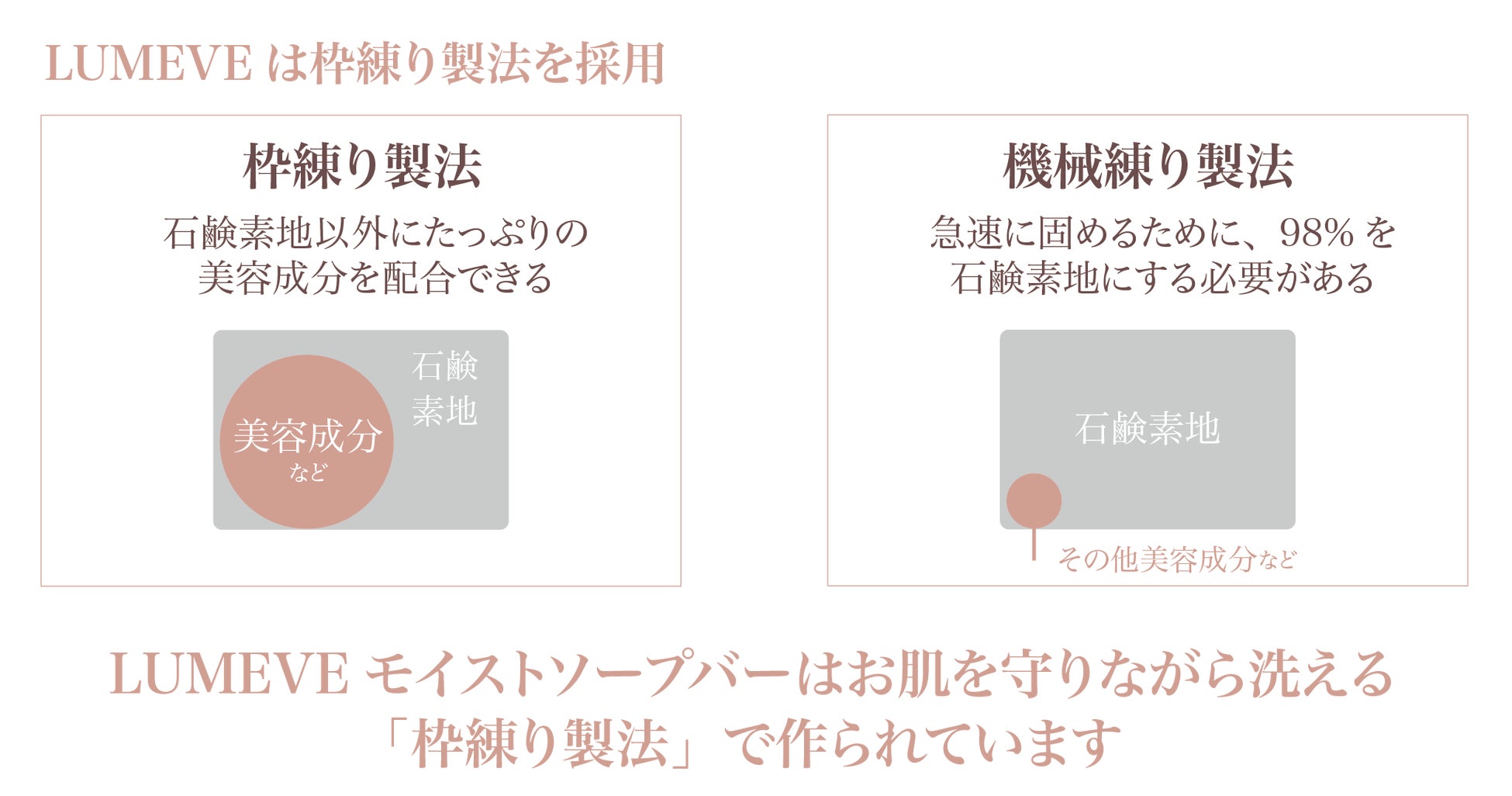 枠練り製法を採用することで、機械練り製法よりも美容液成分をたっぷり配合でき肌を優しく洗い上げます。