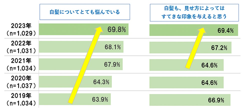 「白髪についてとても悩んでいる」は過去5年で最も高く年々スコアが上昇している。「白髪も、見せ方によってはすてきな印象を与えると思う」は2022年からスコアが上昇。