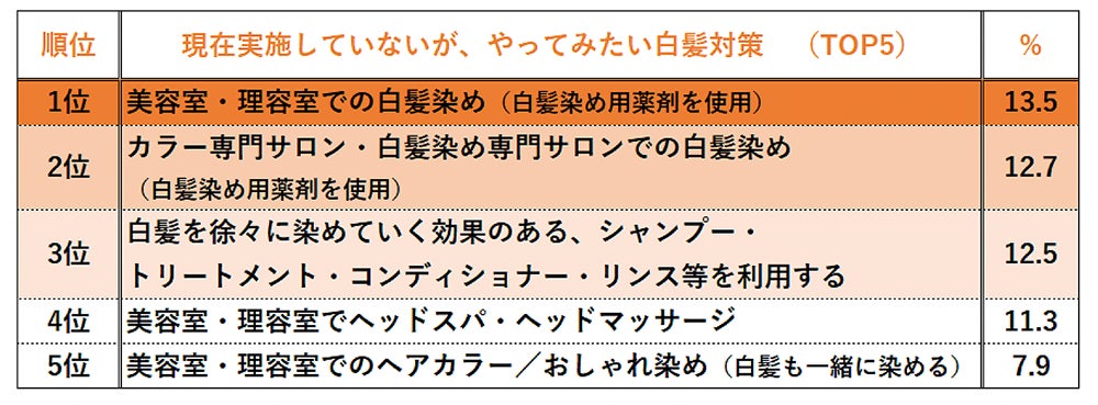 「現在実施している白髪対策」の1位は「美容室・理容室での白髪染め」、2位は「自宅で市販の白髪用ヘアカラーで白髪染め」、3位は「美容室・理容室でのヘアカラー/おしゃれ染め」。一方、「現在実施していないが、やってみたい白髪対策」には、「現在実施している白髪対策」ではTOP5圏外の「カラー専門サロン・白髪染め専門サロンでの白髪染め」「美容室・理容室でヘッドスパ・ヘッドマッサージ」がランクイン。