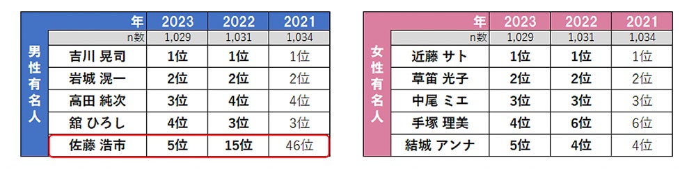 昨年に引き続き、男性有名人は「吉川 晃司」さん、女性有名人は「近藤 サト」さんが1位。男性有名人では、「佐藤 浩市」さんが、前年15位から大きく順位を伸ばし、初のTOP5入り。