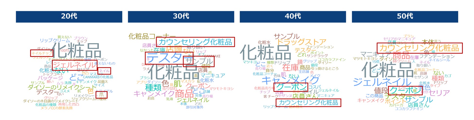 年代別にワードクラウドを作成し、それぞれの特徴的な話題を確認した。 20代はネイル、30代~50代は共通してカウンセリング化粧品ついて話題に挙げており、それに付随してテスター、サンプル、クーポン等も挙がっている。
