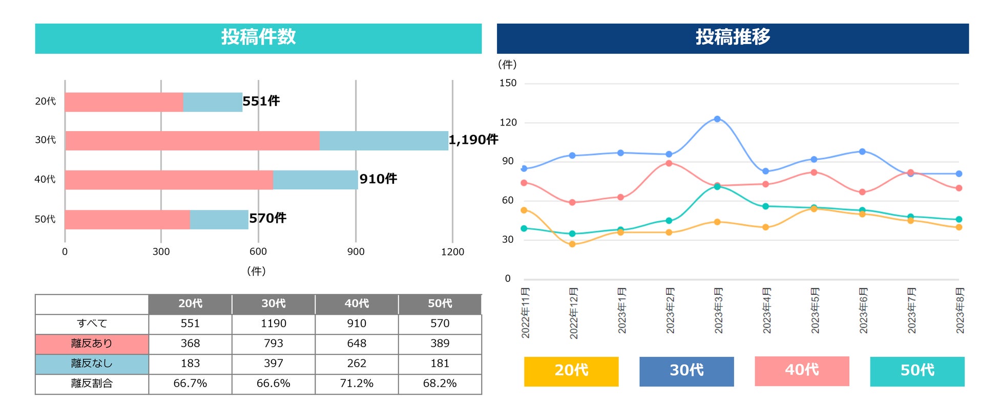 年代別の不満投稿件数、投稿推移及び離反の割合を確認した。 投稿推移はほぼ横ばい。投稿件数上位は 1位 30代 2位 40代 3位 50代 という結果になった。 離反の割合は各世代で65%を超えており、40代は70%超と非常に高い結果となった。