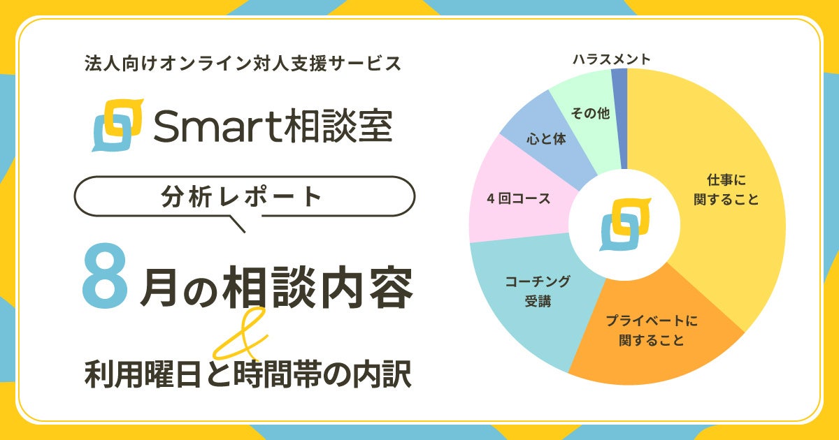 株式会社Smart相談室(本社:東京都港区、代表取締役:藤田 康男)は、法人向けオンライン対人支援サービス「Smart相談室(スマートそうだんしつ)」の、2023年8月の相談内容に関する分析レポートを発表しました。