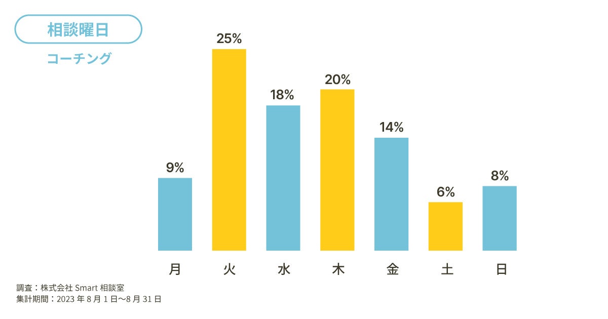 「Smart相談室」でコーチングを受けられている方の利用曜日と時間帯の内訳をまとめました。