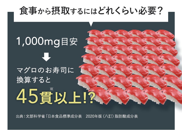 体内でほとんど生成することができないため、日常的な食事から摂取する必要がありますが、DHA・EPAの推奨摂取量は1000mgと言われており、なんとマグロのお寿司では45貫分(※)に該当…。