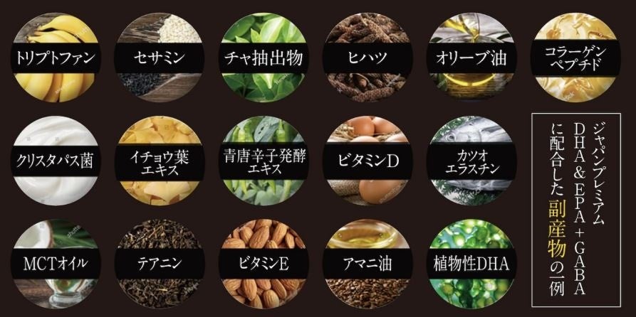 DHA含有精製魚油(国内製造)、澱粉、γ-アミノ酪酸、EPA含有精製魚油、イチョウ葉抽出物、エラスチン、コラーゲンペプチド(ゼラチンを含む)、ビタミンE含有植物油、ヒハツ抽出物、殺菌乳酸菌末、食用アマニ油、食用オリーブ油、食用ごま油、食用油脂、青トウガラシ発酵抽出物、藻類由来DHA含有油/グリセリン、ゲル化剤(カラギナン)、グリセリン脂肪酸エステル、酸化防止剤(ビタミンE、チャ抽出物)、L-テアニン、L-トリプトファン、ビタミンD