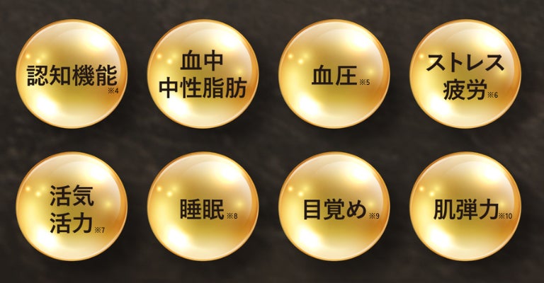 これにより、「認知機能(※4)」 「血中中性脂肪」 「血圧(※5)」 「ストレス疲労(※6)」 「活気活力(※7)」 「睡眠の質(※8)」 「目覚め(※9)」 「肌弾力(※10)」と、”日本最多”(※3)となる8つの機能性を実現しています。