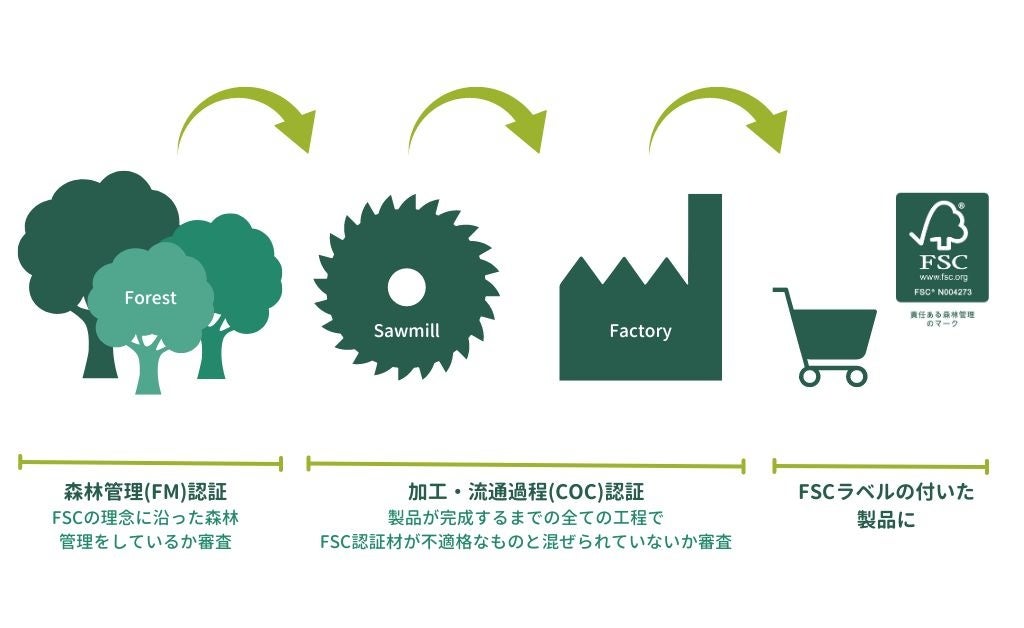 FSC®認証とは、適切な管理のもと木材を生産する森林と、加工・流通の段階で不適格な木材と混在しないよう関わるすべての組織が認証を受ける仕組みです。