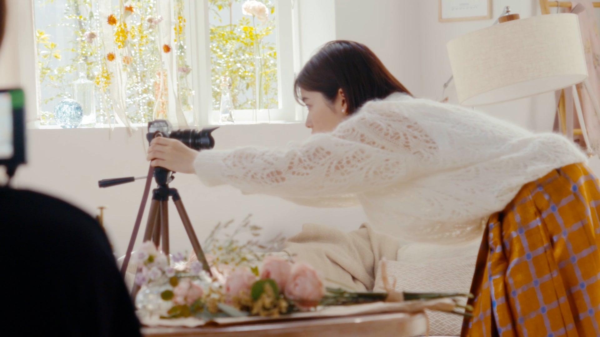 今回のCMは、カメラのレンズを覗き込む小芝さんの可愛らしいアップから始まります。自然光が明るく照らす部屋にお手製の写真館をセッティングして、フレッシュなお花を手にセルフィー撮影会を楽しんでいます。