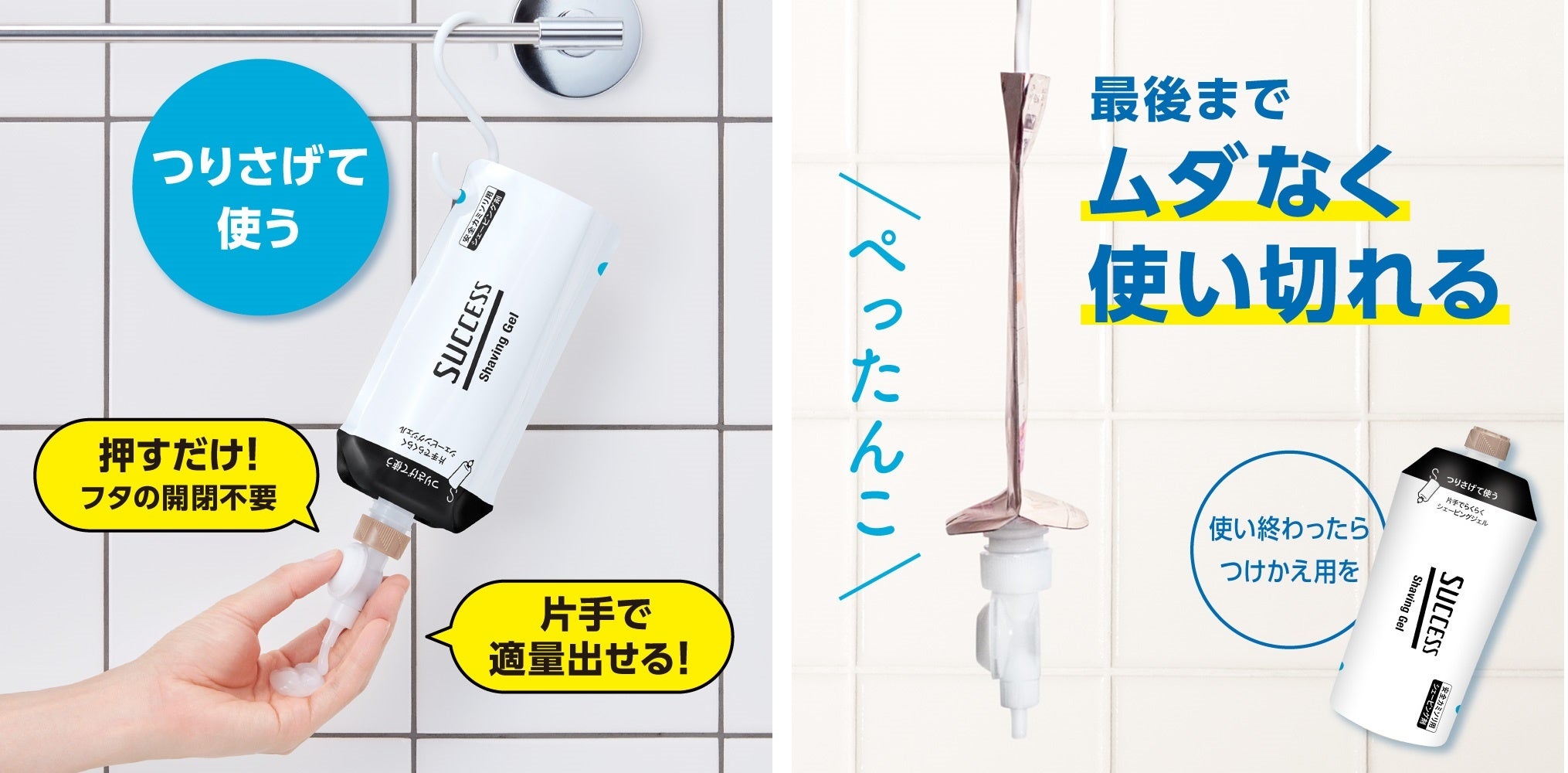 「毎日のシェービング、なるべくサッと済ませたい」といった気持ちに応える新提案です。片手でプッシュとするだけで適量が出る、“つりさげて使う”シェービングジェルなので、手に出してすぐに剃り始めることができます。また、最後までムダなく使いきれるフィルム容器で、使い切った後はコンパクトに折りたためます。さらに、つけかえ式なので従来のボトル容器(『サクセス 薬用シェービングジェル』)と比較してプラスチック使用量を約70%削減*し、環境にも配慮しました。