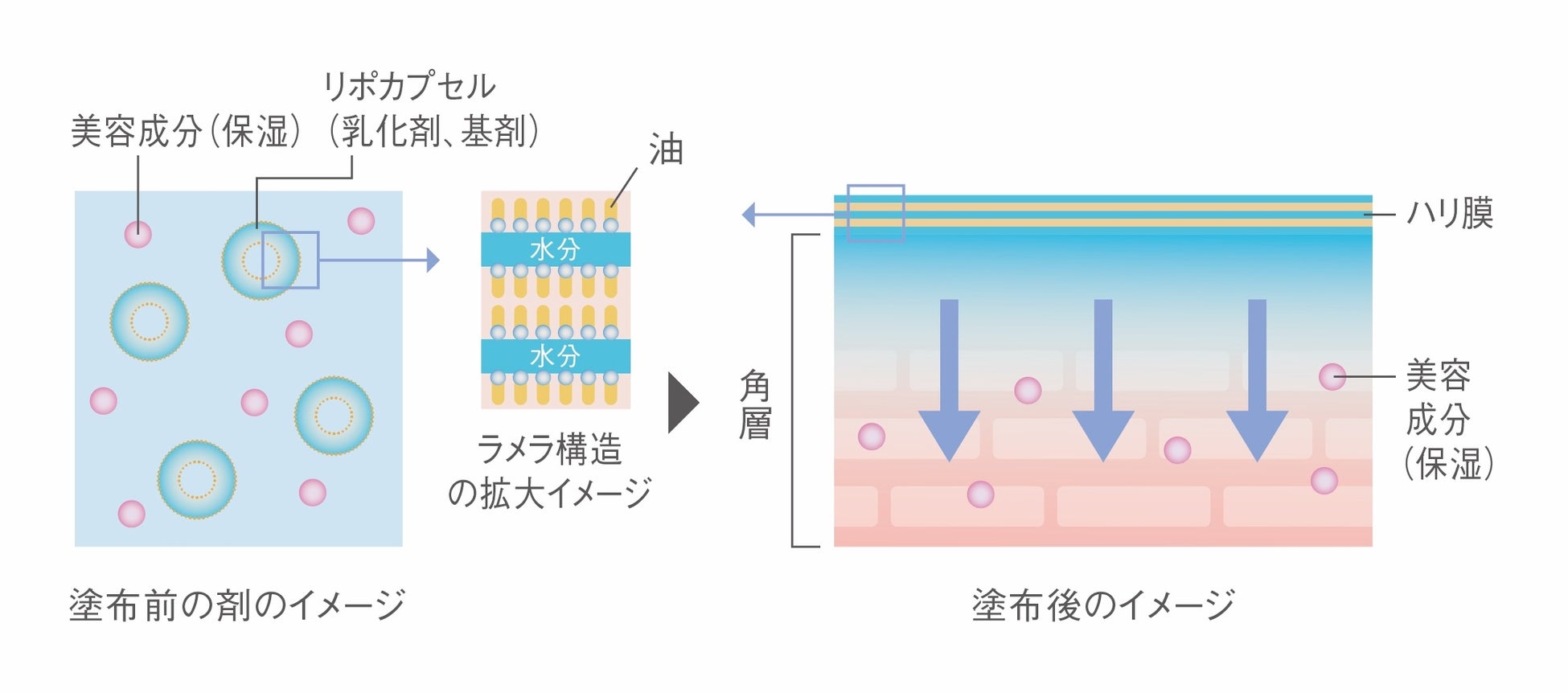 肌の保湿機能を担う角層の細胞間脂質に似たラメラ構造をもつリポカプセル*(乳化剤、基剤)を配合。
