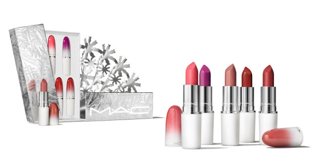 M·A·Cで大人気シアーなツヤ発色のラスターガラス リップスティックから、人気色(ハグ ミー、ピー ディー エー、ビジネス カジュアル)とホリデー限定色が詰まった贅沢なリップ現品5色入りセットが登場。 ホリデーならではのスノーホワイトを感じさせる限定パッケージにも注目。