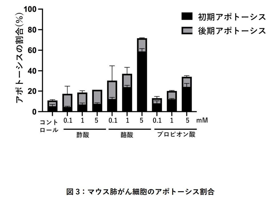 ユーグレナ抽出物の肺がん抑制効果における短鎖脂肪酸(酢酸、酪酸、プロピオン酸)の関与を明らかにするために、肺がん細胞を用いた実験を行いました。肺がん細胞に酢酸、酪酸、プロピオン酸をそれぞれ添加し、48時間培養後、フローサイトメトリー※6を用いて肺がん細胞のアポトーシス※2割合を測定しました。その結果、コントロールと比較して、特に酪酸の添加によって、肺がん細胞のアポトーシス割合が高くなることがわかりました(図3)。
