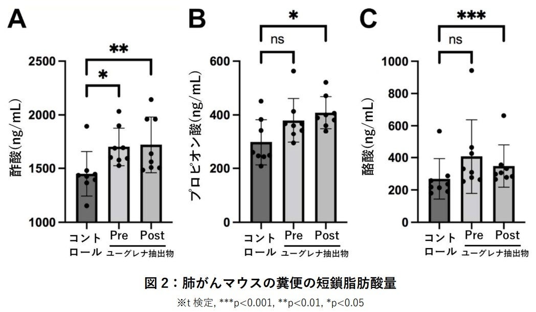 微細藻類ユーグレナ粉末抽出物による肺がん増殖抑制効果は、腸内細菌叢から産生される短鎖脂肪酸によるがん細胞のアポトーシスの誘発によって起こっている可能性を確認しました