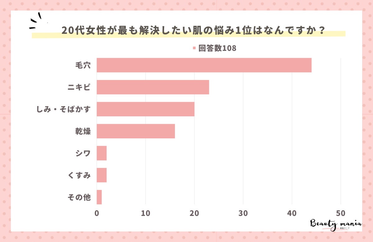 「20代女性が最も解決したい肌の悩み1位はなんですか?」とアンケート調査した結果、1位は『毛穴(44人)』、2位は『ニキビ(23人)』、3位は『しみ・そばかす(20人)』となっています。