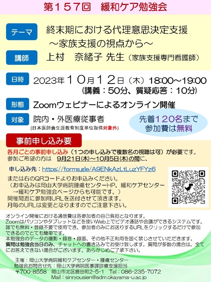 ※ メールタイトルの頭に【第157回 緩和ケア勉強会】と記載ください