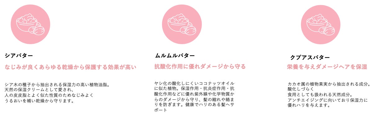 こだわりのシアバター・ムルムルバター・クプアスバターを贅沢に配合し、髪にも肌にも優しく潤う