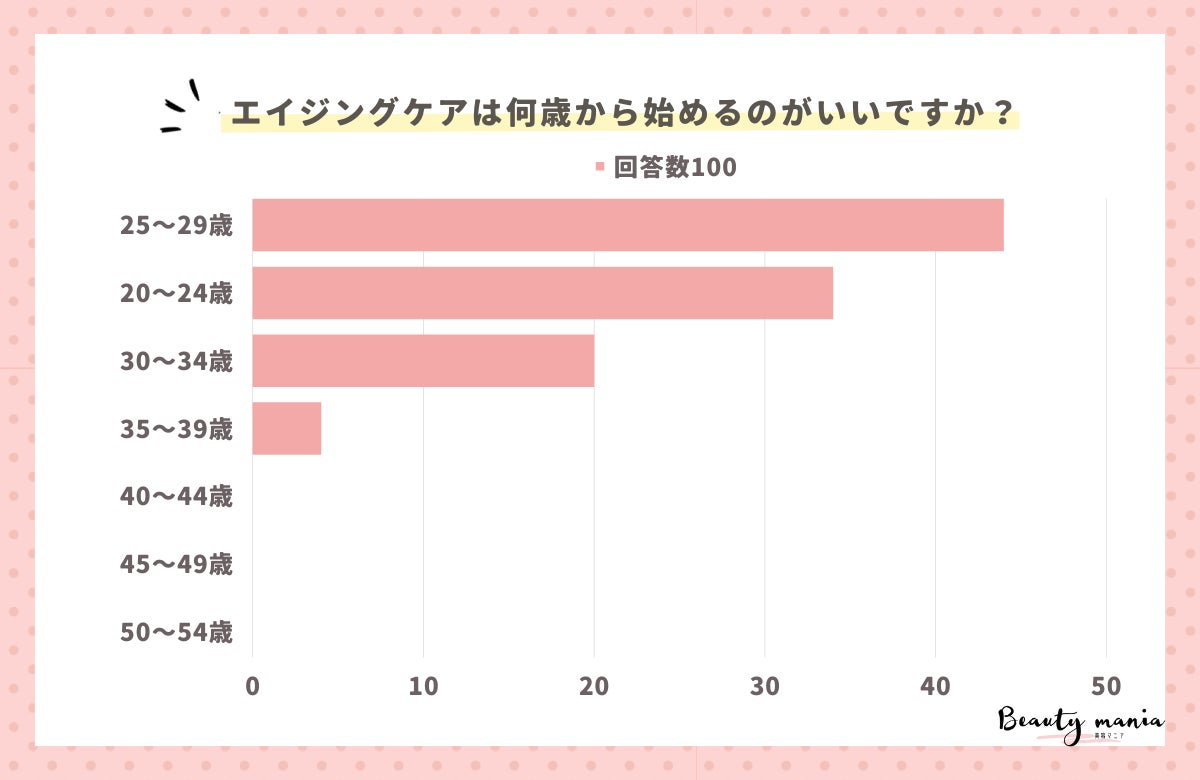 「エイジングケアは何歳から始めるのがいいですか?」とアンケート調査した結果、1位は『25〜29歳(44人)』、2位は『20〜24歳(34人)』、3位は『30〜34歳(20人)』となっています。