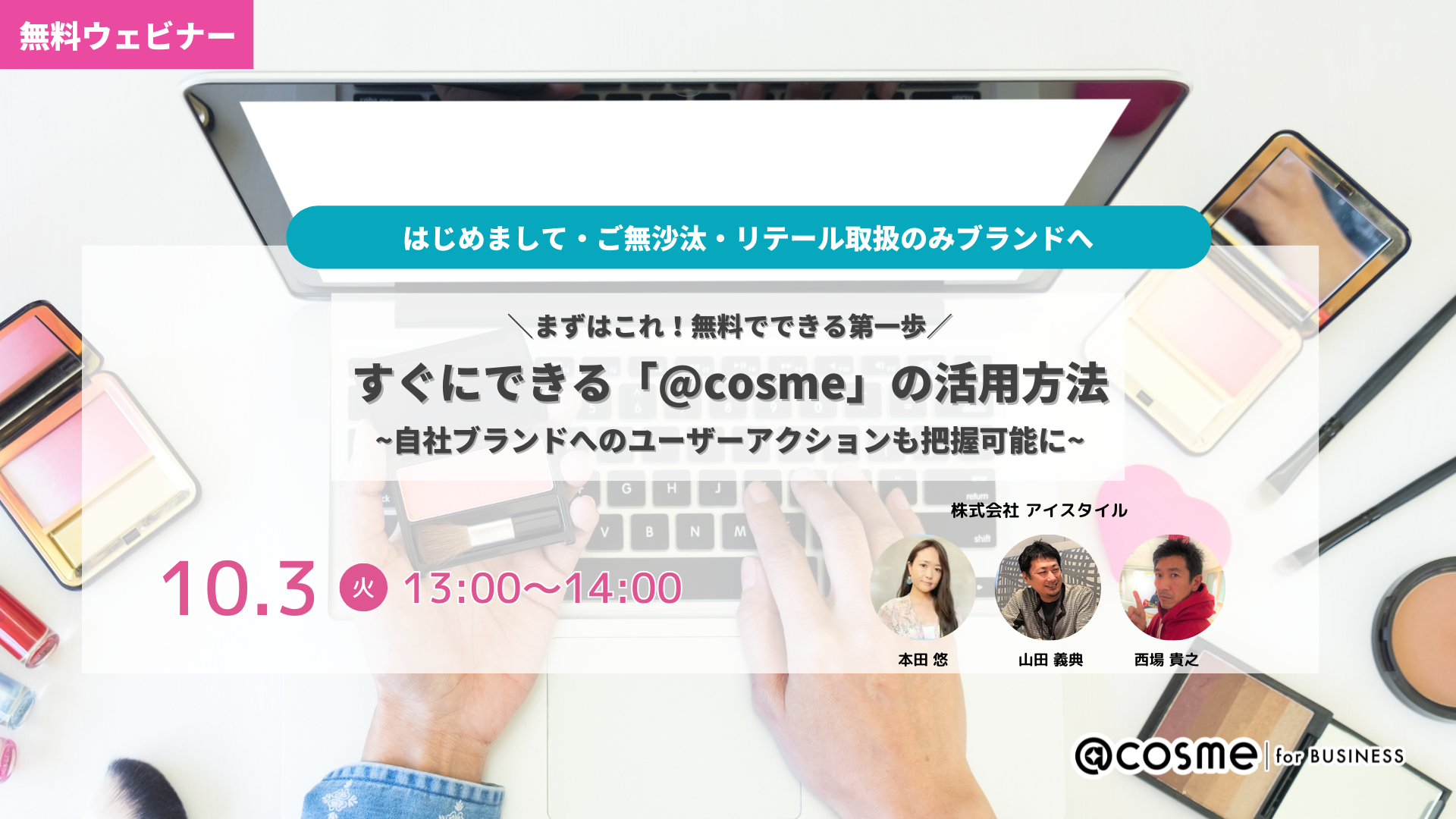 株式会社アイスタイル(代表取締役社長 兼 COO:遠藤 宗)は、2023年10月3日(火)に、ウェビナーイベント『まずはこれ!無料でできる第一歩。すぐにできる「@cosme」の活用方法』を開催することをお知らせいたします。