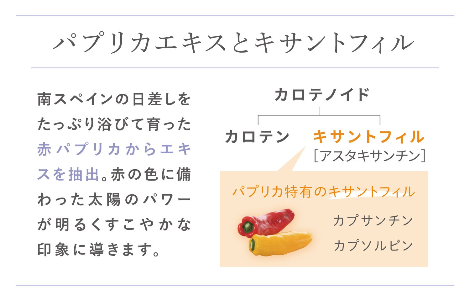 肌の弾力を維持するキサントフィルがぎゅっと濃縮。 パプリカの”赤”のチカラが、紫外線などの過酷な環境ストレスにさらされがちな肌を、弾むハリ肌に導きます。