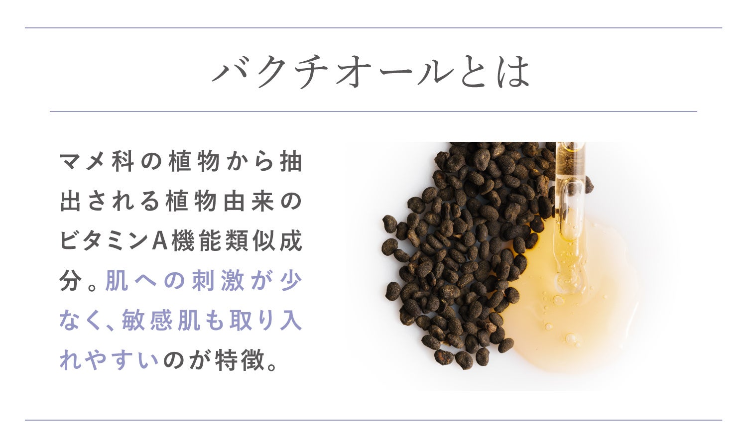 いま世界中で話題を集める次世代レチノール「バクチオール」。レチノールと同等の肌にうれしいはたらきを持ちながら、刺激が少なく敏感肌も取り入れやすいのが特徴。ぷるんと若々しい印象を与えます。