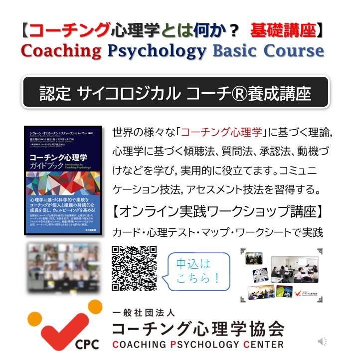 コーチングとコーチング心理学をわかりやすく紹介,実践的な内容を目指しています。*《NEW》資格認定+書籍(コーチング心理学ガイドブック)を割引で購入できるコースが新設されました。割引価格(1670円引き)で購入できます。【認定サイコロジカルコーチ(BASIC)養成講座】初心者・経験者歓迎