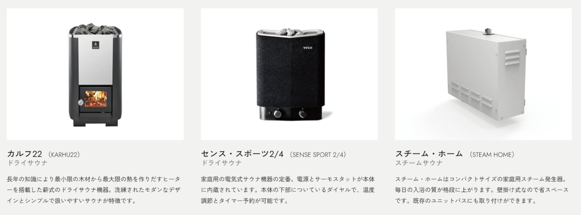 写真:AITOHUSが運営する専門店「AITOSAUNA」で取り扱うサウナヒーターの一部。詳細は https://aitosauna.jp/ をご覧ください。