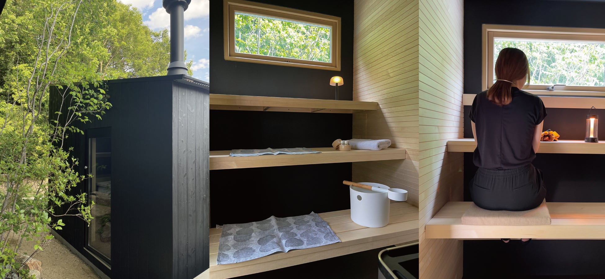 写真:2023年6月、「AITOLIV+」敷地内に完成したばかりの薪サウナ小屋。フィンランド最古の薪サウナブランドである「KASTOR」のヒーターを採用し、薪の香りとともに高温でも不思議とまろやかなロウリュが楽しめるのが特徴です。サウナとして使用しないときはテレワークにも活用できるようにデザインされています。