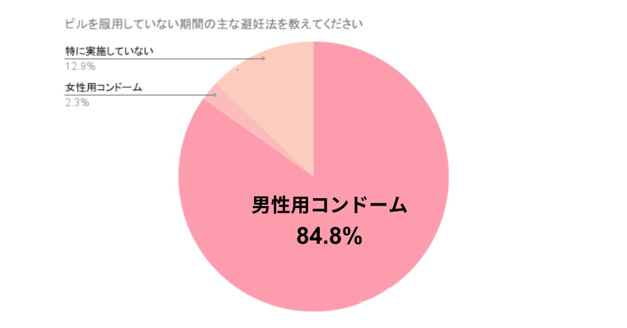ピルを服用していない期間の主な避妊法については、「男性用コンドーム」と回答した方が約85%。今まで行ったことのある避妊法(複数選択可)に関しては、1位「男性用コンドーム(48.9%)」、2位「低用量ピル(48.6%)」が上位を占めました。