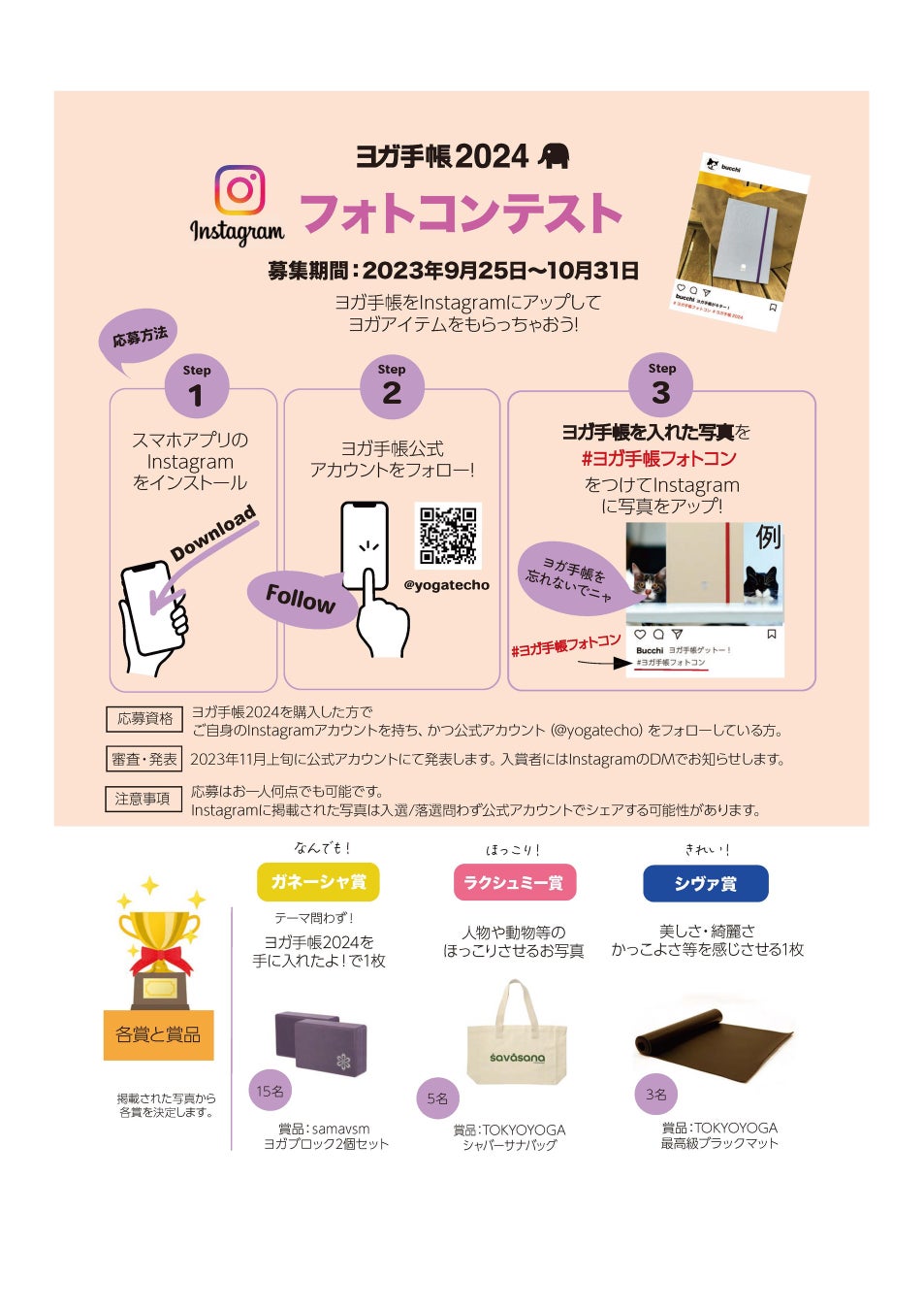 応募方法:スマホアプリのInstagramをインストールしヨガ手帳公式アカウントをフォロー(@yogatecho)ヨガ手帳を入れた写真を「#ヨガ手帳フォトコン」をつけてアップしてください。