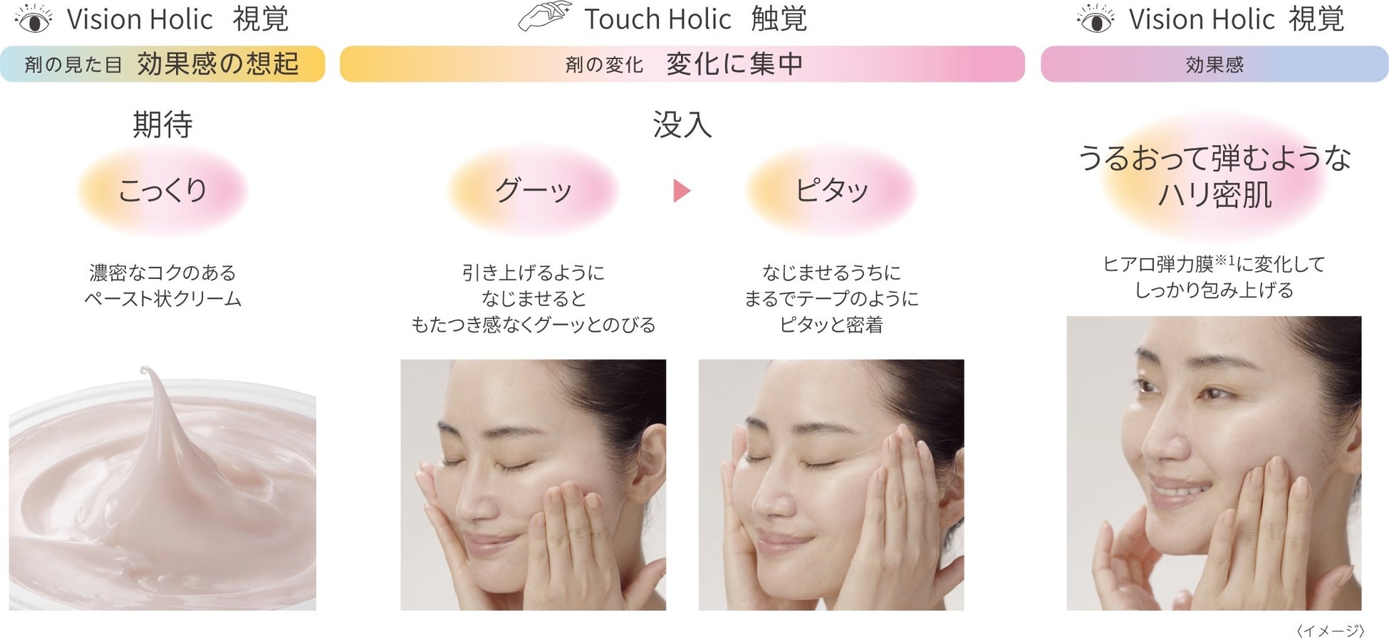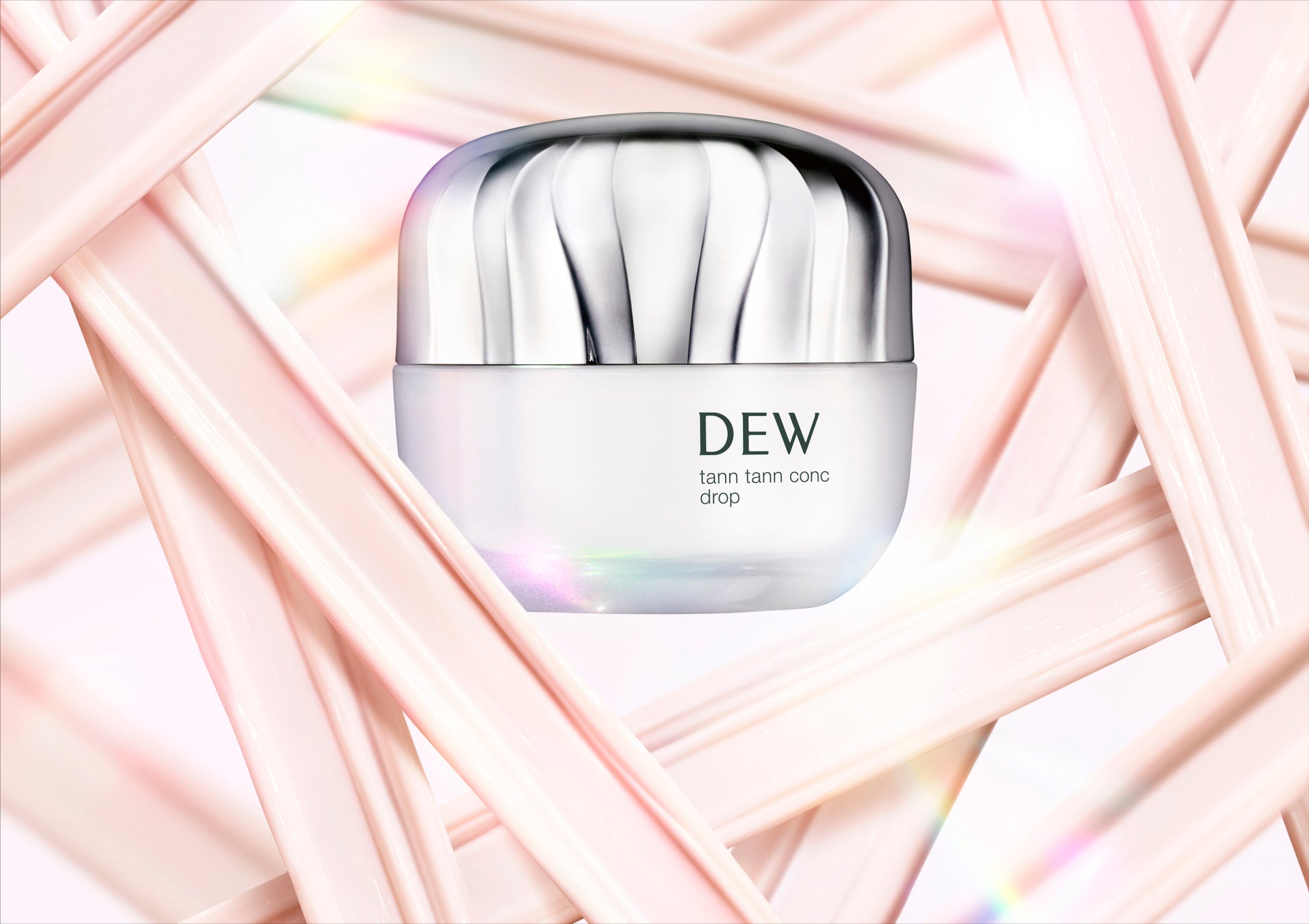 「DEW(デュウ)」は、感触や香りなどを楽しみ、見ただけ、触れただけでスキンケアの「虜」になるようなアイテムを目指し、40年以上続くヒアルロン酸研究から生まれた保湿成分や、濃密なとろみのあるテクスチャーや香りといった使用感も徹底的に追及しています。