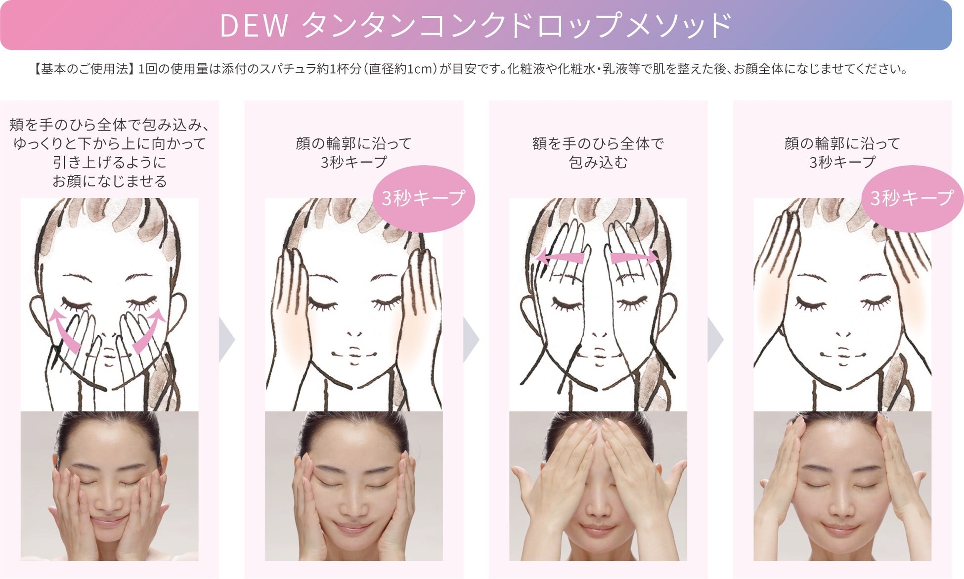 この度発売するクリーム「DEW タンタンコンクドロップ」は、濃密なコクのあるクリームをフェイスラインまで引き上げるようになじませるとグーッとのびて、まるでテープのようにピタッと密着します。独自開発成分「ヒアロバウンスヴェール※1(保湿)」を配合し、うるおって弾むようなハリ密肌に導きます。