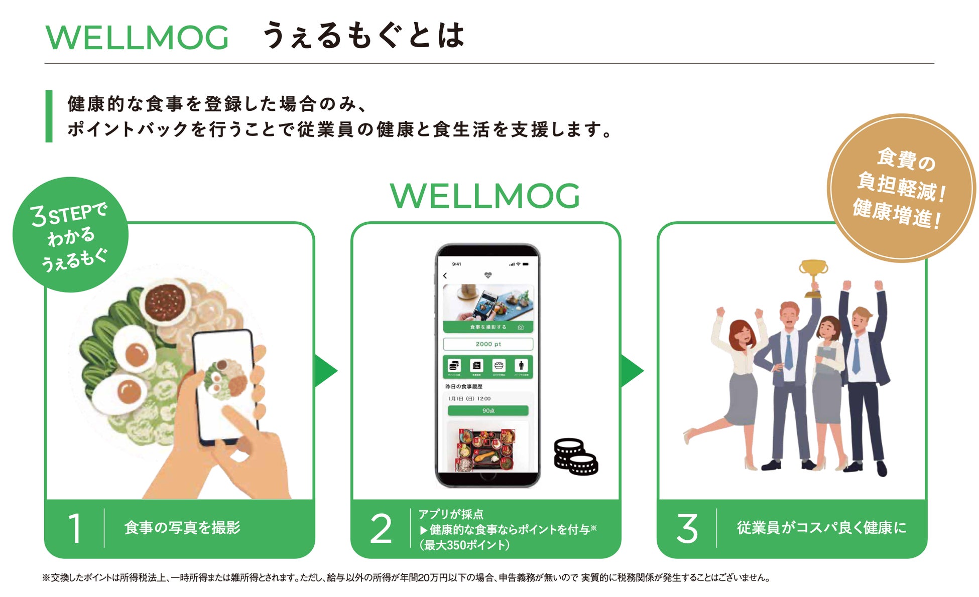 うぇるもぐは、全国のコンビニエンスストアや飲食店を対象に、個人の健康状態に合わせた食事をレコメンドし、食事の栄養バランスに応じてポイントを付与することで食事の指導と支援を同時にできる福利厚生アプリです。