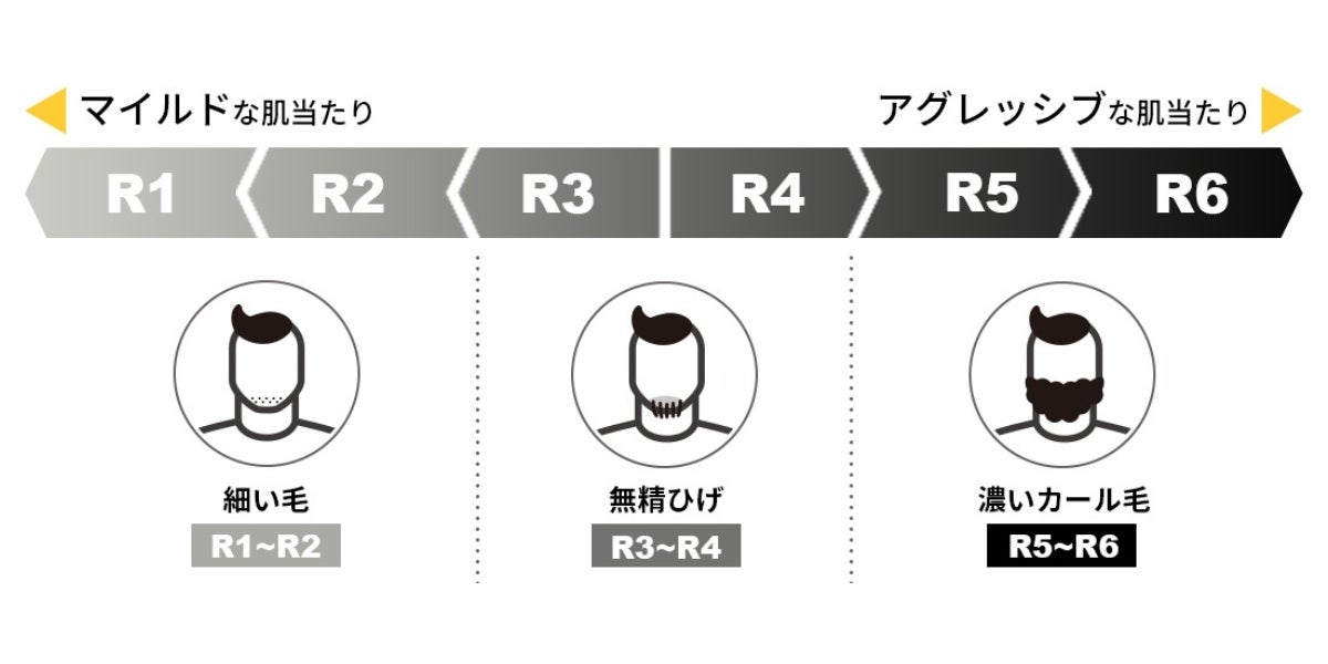 R1からR6まで用意されているサイズのうち、例えば顔のシェービングにはR3.4を設定し、敏感な顎下のシェービングにはR1.2を設定する等、の使い方ができます。つまりR1からR6までの間をカチッとカチッと1段階ずつ調整するのではなく、文字通りダイヤル式に無段階調整することができます。