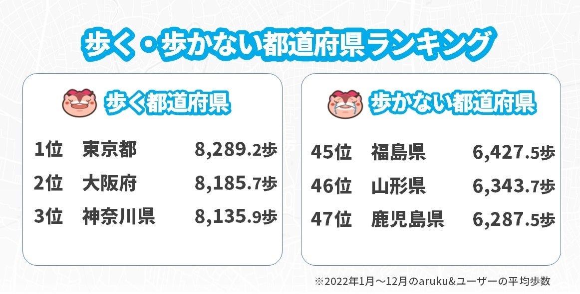 10月4日「徒歩の日」を前に、昨年1年間の都道府県別aruku&ユーザーの1日あたりの平均歩数を算出し、「歩く県・歩かない県」をランキングにしてみました。