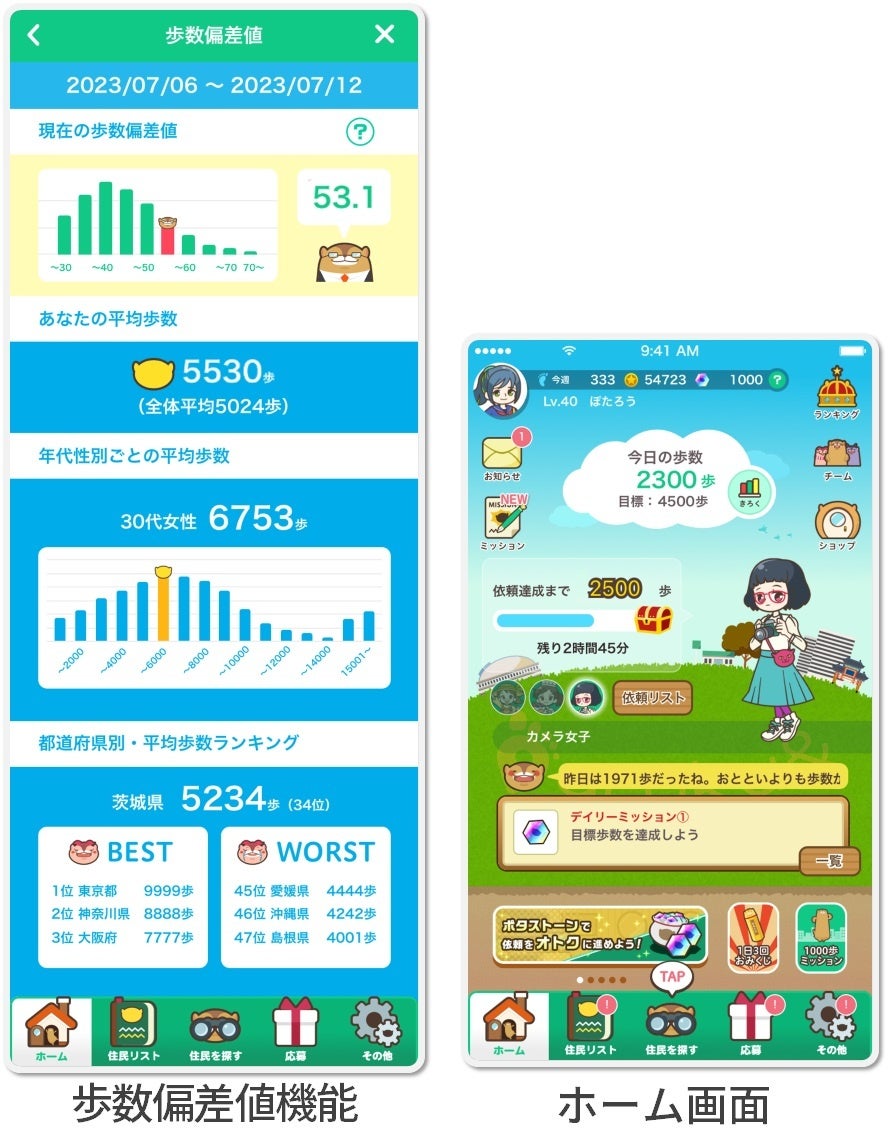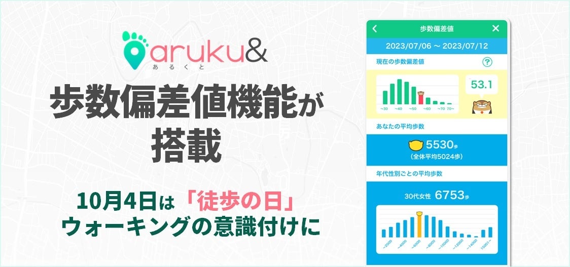 今回の新機能追加により、歩数や消費カロリーなどが確認できる「きろく」内で、自身の「歩数偏差値」や年代・性別、居住都道府県の平均歩数を確認できるようになりました。また、ホーム画面ではaruku&のキャラクター「ぽたろう」が前日の歩数に応じて声掛けをしてくれる機能も搭載しました。aruku&を毎日楽しく使い続け、歩く習慣や意識付けが身につきやすくなりました。