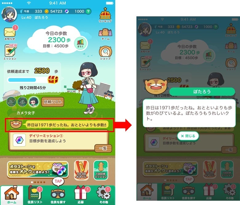 ホーム画面で前日の歩数などによって「昨日は〇歩だったね。この調子で頑張るクト!」「昨日は1万歩達成〇日目!」などキャラクター「ぽたろう」が褒めてくれる機能です。