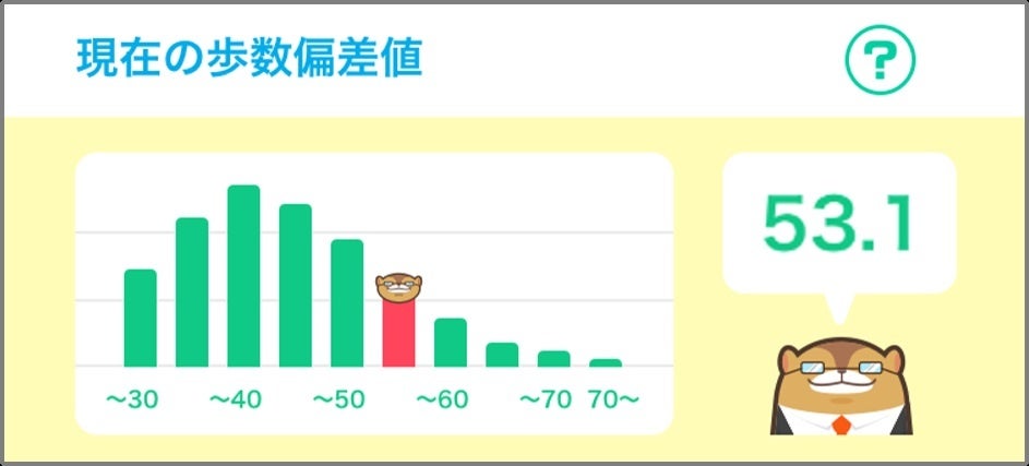 aruku&全ユーザーの中での歩数偏差値を示します。全体の偏差値分布グラフでは自分の位置もわかります。「歩数偏差値」は、前日~7日前までの歩数から独自の計算方法により算出しています。歩数だけでなく、毎日の歩数の差を少なくすることで偏差値が上がりやすくなります。