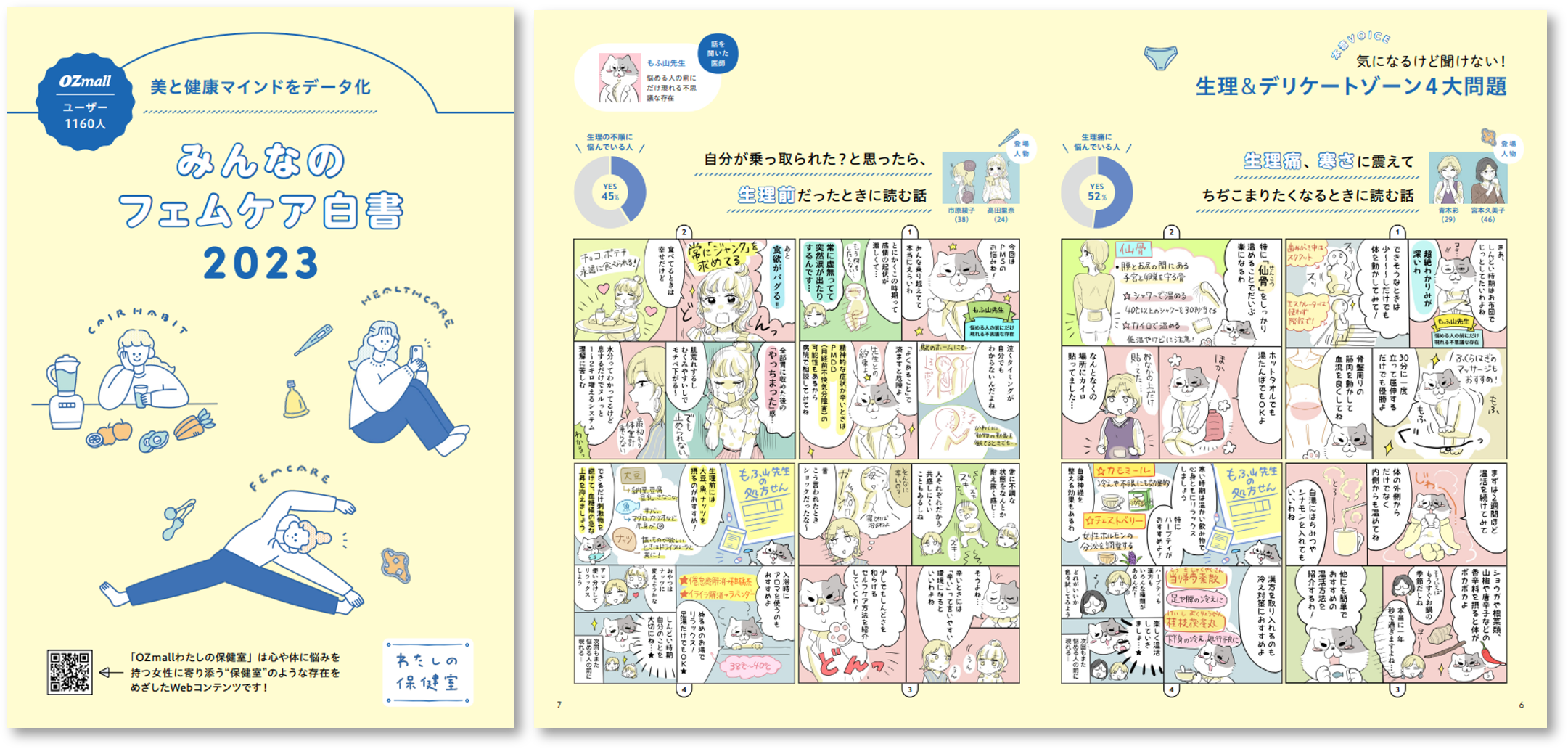 ブース掲示のフェムケア意識調査のほか、美容・健康アンケート、OZmallで人気の漫画連載「もふやま先生の相談室」や、おすすめフェムケアアイテムが掲載された冊子をこの展示会限定で配布。