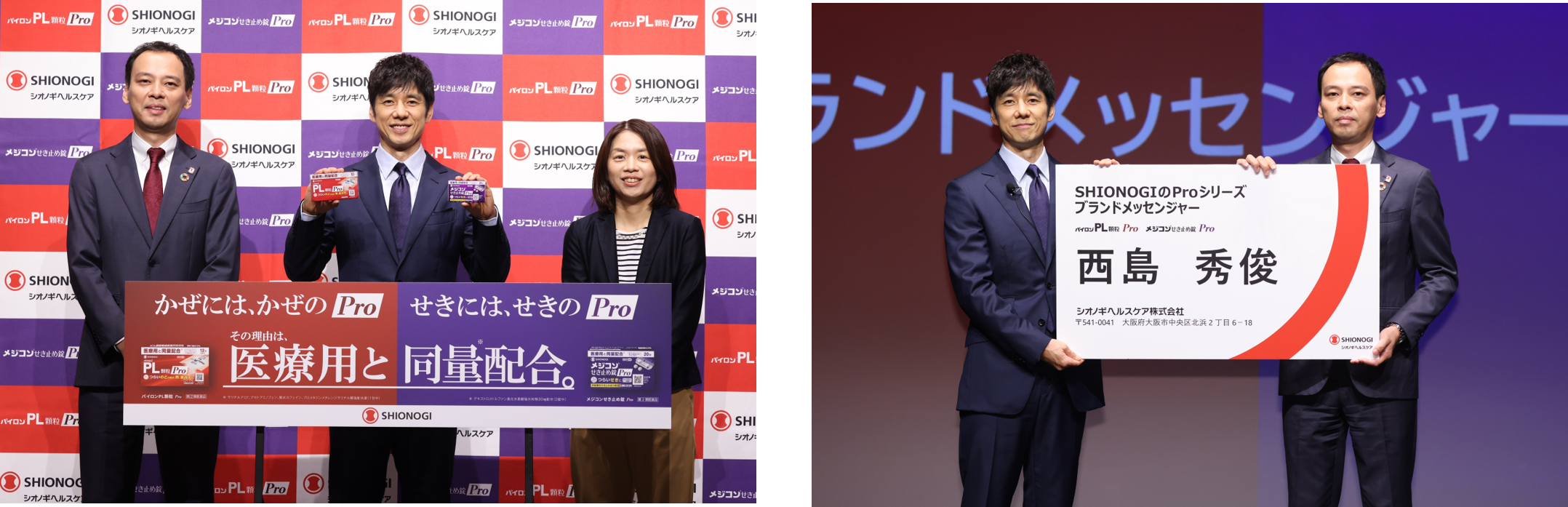 イベントでは、新CMに出演している西島秀俊さんが登場。新CMが上映されると「怖い顔にならないように程よく力強さを表現しProシリーズの力強さや説得力を伝えられるように意識した。」と撮影の裏話を語っていただきました。その後、シオノギヘルスケア株式会社の経営戦略部 加曽利部長から名刺が贈られ、SHIONOGIのProシリーズ ブランドメッセンジャーに任命された西島さん。ブランドメッセンジャー就任にあたっては、「ブランドメッセンジャーにご指名頂き光栄です。季節の変わり目で体調を崩すこともあると思います。その時はSHIONOGIのProシリーズを思い出してもらうためにその良さを伝えていきたい」と力強く意気込みを語っていただきました。