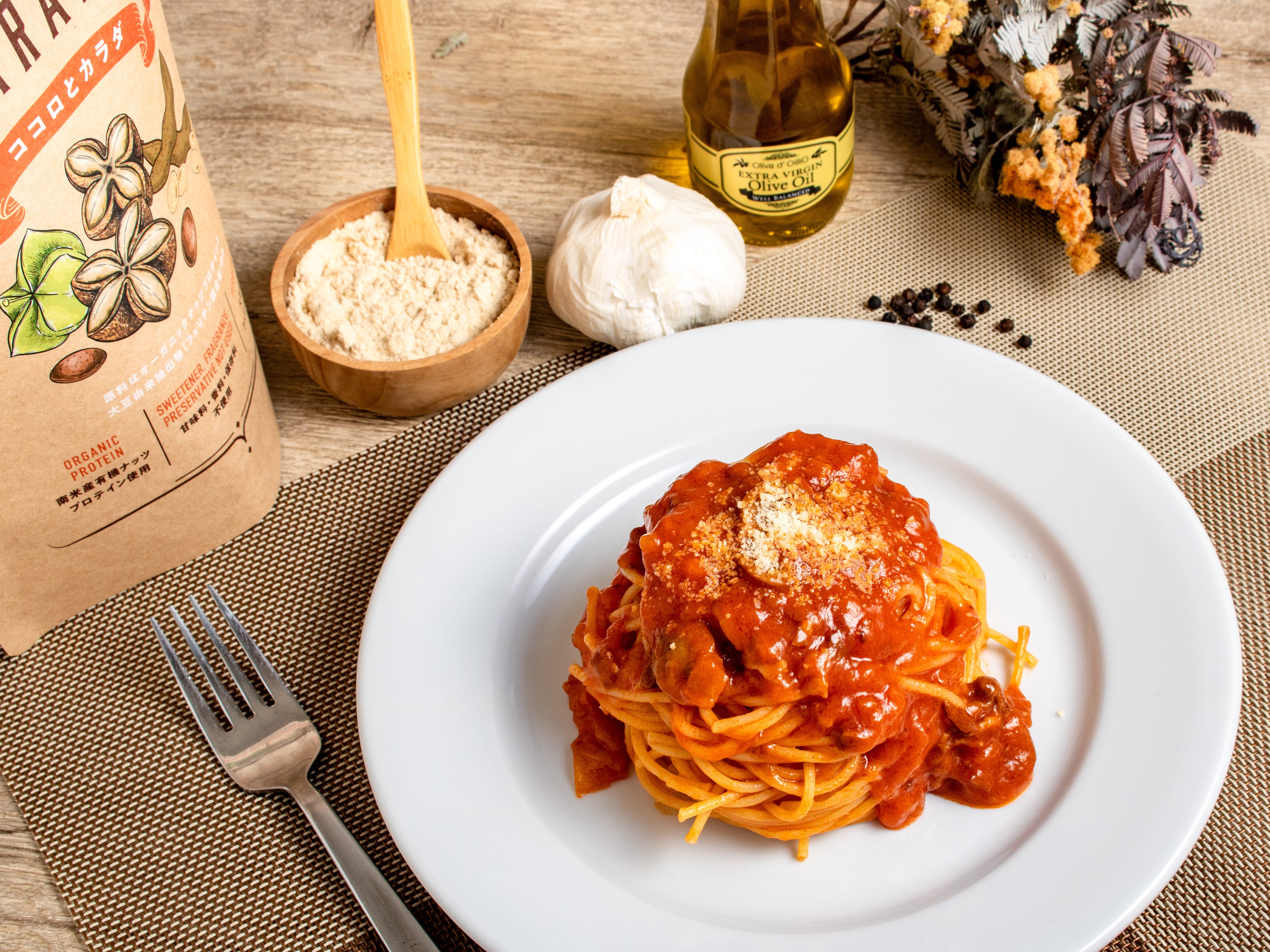 お好みのパスタソースに最後に「ココロとカラダ」を混ぜることで、ソースの風味を変えずにタンパク質を底上げできます。