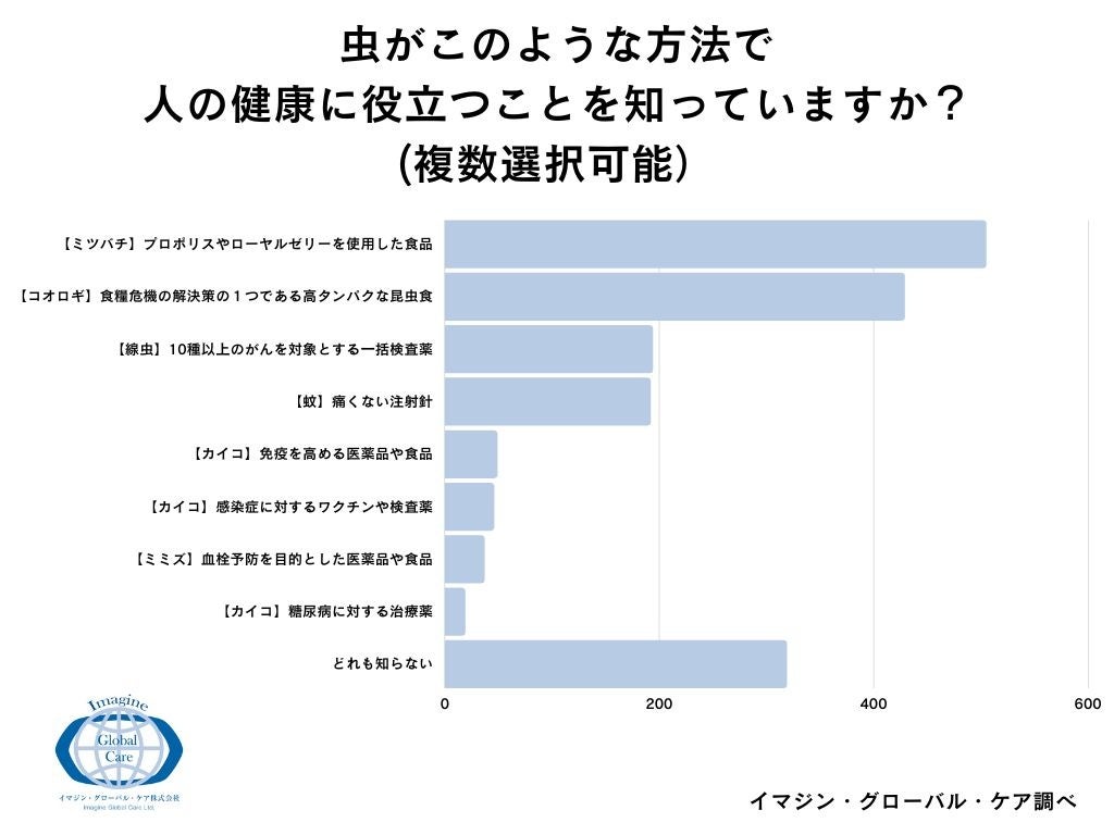 「虫がこのような方法で人の健康に役立つことを知っていますか?」という質問に対し、「【ミツバチ】プロポリスやローヤルゼリーを使用した食品」が76.5%と最も多く、次に、「【コオロギ】食糧危機の解決策の1つである高タンパクな昆虫食」が65.0%となりました。