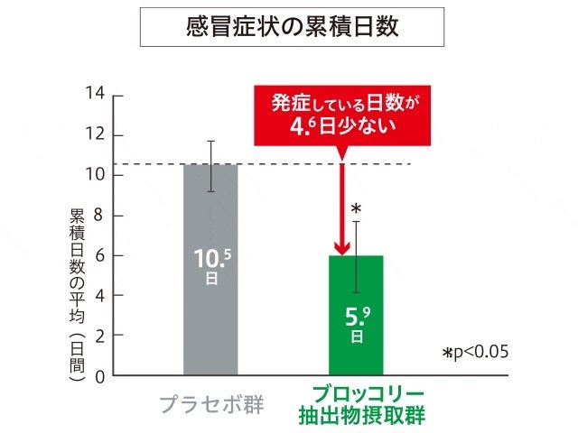 また2022年の臨床試験では、ブロッコリー抽出エキスを経口摂取したときに、風邪様症状の発症リスクの低下を調べました。