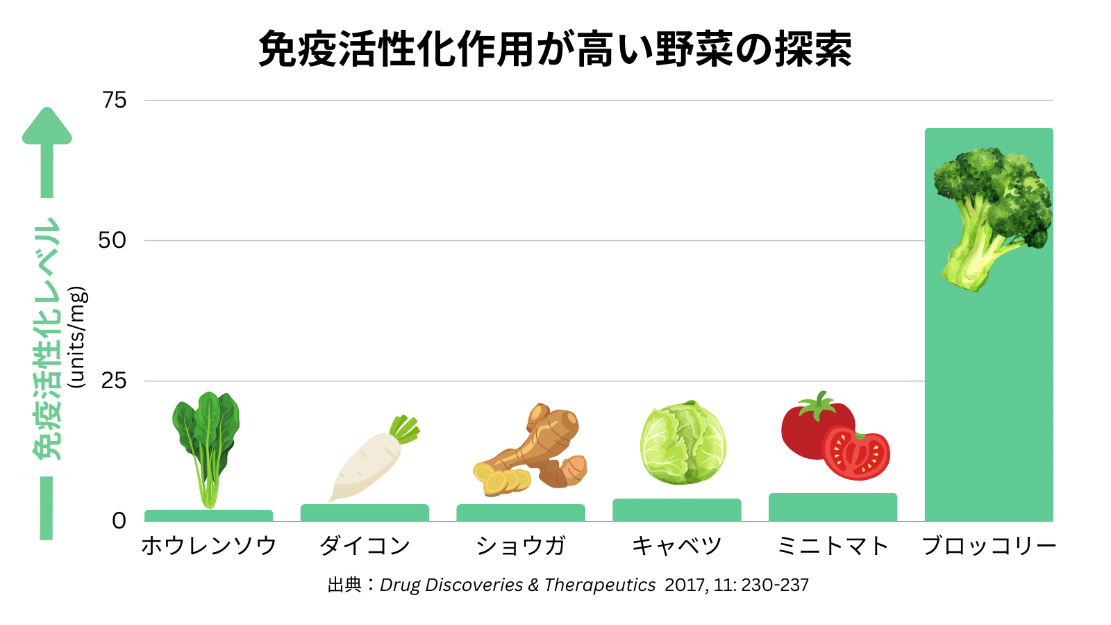 そういったカイコの研究で何十種もの様々な野菜や果物から抽出したエキスを使って免疫活性レベルを比較しました。その結果、実験に用いた他のどの植物よりも、ブロッコリー抽出エキスが免疫を活性化する作用があることがわかりました。
