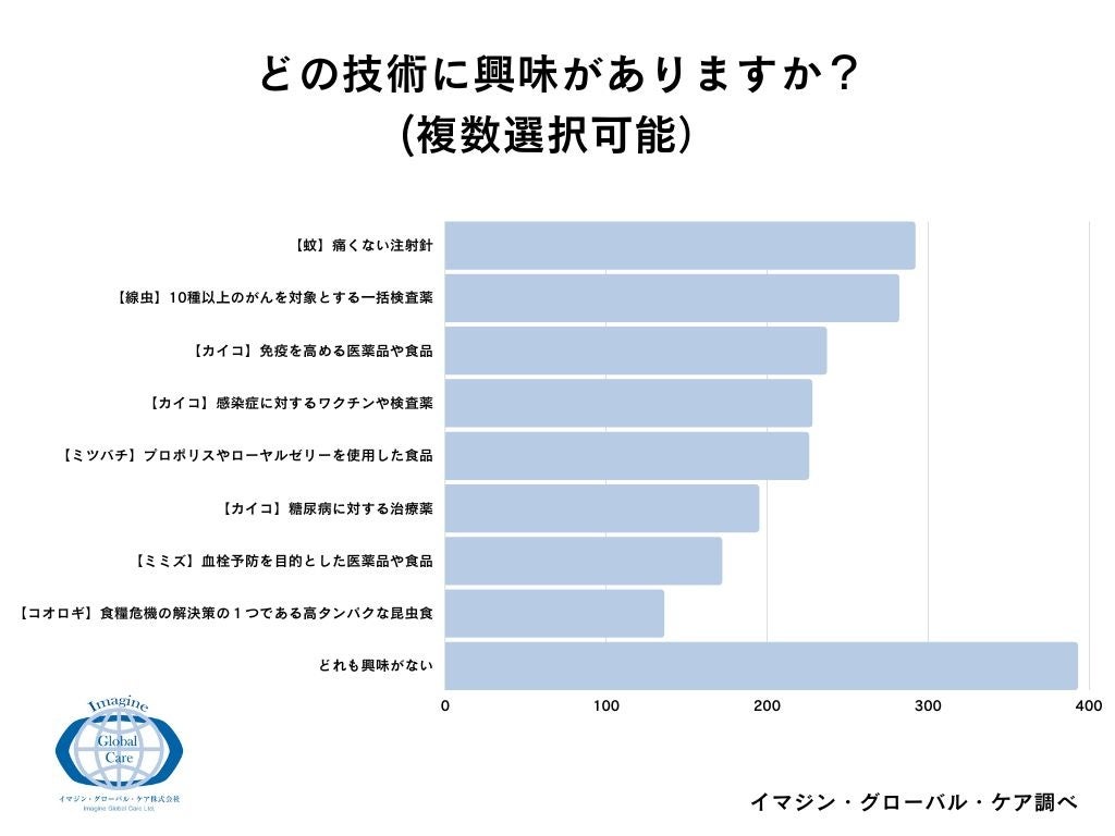 また、「どの技術に興味がありますか?(利用したことがある、利用してみたい、早く実現してほしいものを選んでください。)」という質問に対し、「【蚊】痛くない注射針」が49.8%と最も多く、次に、「【線虫】10種以上のがんを対象とする一括検査薬」が48.1%となりました。